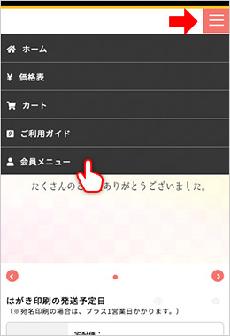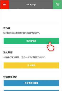 『住所録管理』画面へは、ヘッダーの会員メニューを選択し「マイページ」を表示してください。