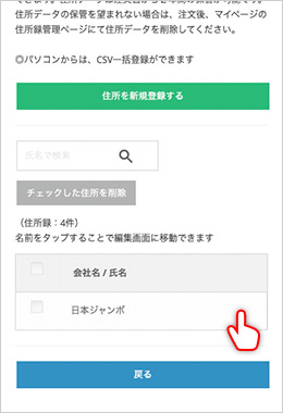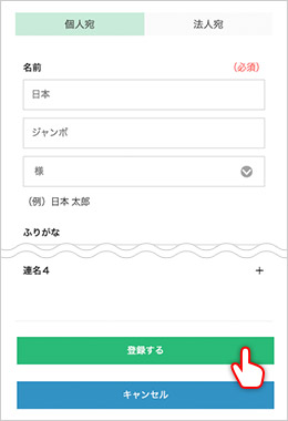 「登録する」ボタンをタップすると、再度「宛名選択」画面が表示され、住所録に先ほど編集した内容が表示されます。