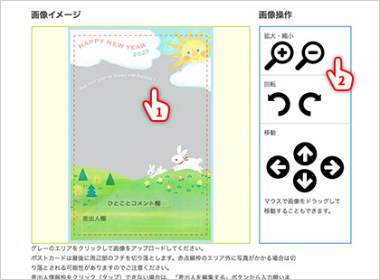 ① テンプレートデザインの写真適用エリア(グレーのエリア)をクリックし画像を追加します。