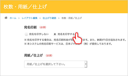 「宛名を印字する」にチェックをし、用紙/仕上げを選択してください。
