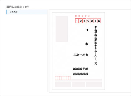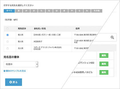 登録済みの住所録から、印字する住所にチェックを入れ、宛名面の書体を選択できたら印刷イメージを確認してください。