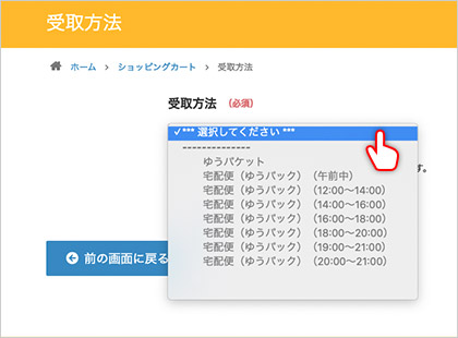 受け取り方法を選択して「支払い方法を選択する」ボタンをクリックし、次の画面で「お届け先」、「支払い方法」を選択して注文手続きを完了してください。